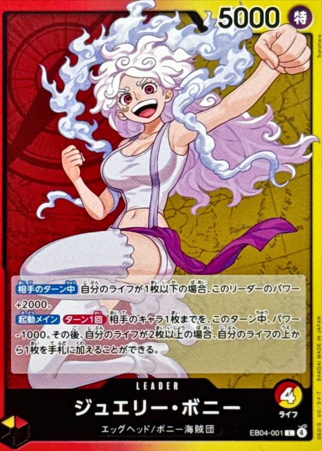 【相手のターン中】自分のライフが1枚以下の場合、このリーダーのパワー+2000。【起動メイン】【ターン1回】相手のキャラ1枚までを、このターン中、パワー-1000。その後、自分のライフが2枚以上の場合、自分のライフの上から1枚を手札に加えることができる。