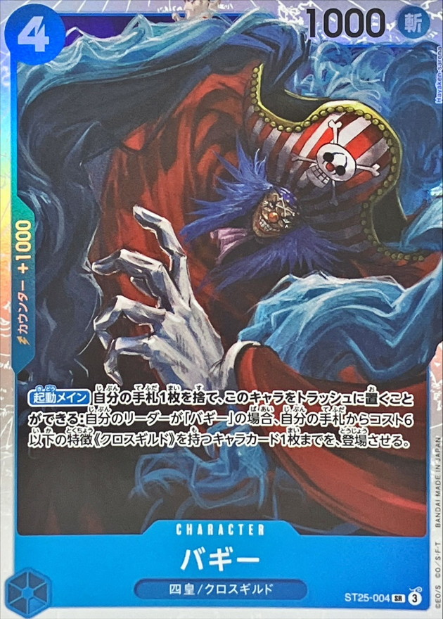 ※製造場所や時期、封入パックの種類によって色合い、紙質、光り方、その他特徴 ≪コスト≫ 4 ≪属性≫ 斬 ≪パワー≫ 1000 ≪カウンター≫ 1000 ≪色≫ 青 ≪特徴≫ 四皇/クロスギルド ≪テキスト≫ 【起動メイン】自分の手札1枚を捨て、このキャラをトラッシュに置くことができる:自分のリーダーが「バギー」の場合、自分の手札からコスト6以下の特徴《クロスギルド》を持つキャラカード1枚までを、登場させる。