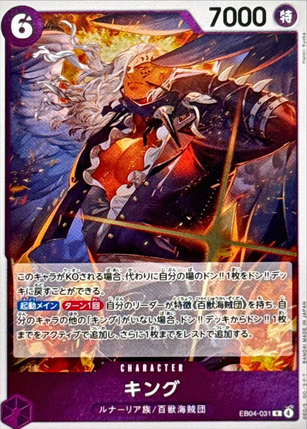 このキャラがKOされる場合、代わりに自分の場のドン!!1枚をドン!!デッキに戻すことができる。【起動メイン】【ターン1回】自分のリーダーが特徴《百獣海賊団》を持ち、自分のキャラの他の「キング」がいない場合、ドン!!デッキからドン!!1枚までをアクティブで追加し、さらに1枚までをレストで追加する。